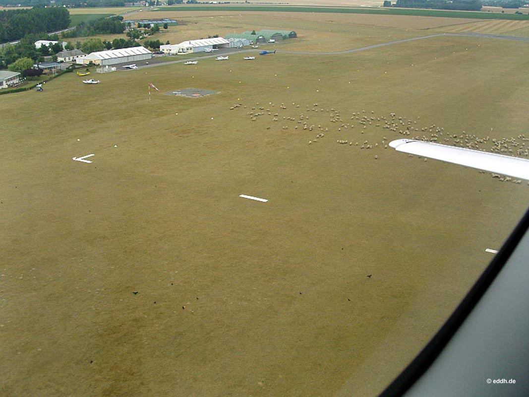 Gerade noch einmal davongekommen... ...ist hier eddh-ler Oltmann Bunger. Unmittelbar nach seinem Abflug von Abbeville stürzte sich die Schafherde wieder mit Wonne auf die Grass-Runway...
