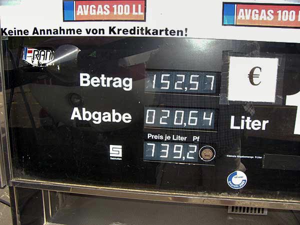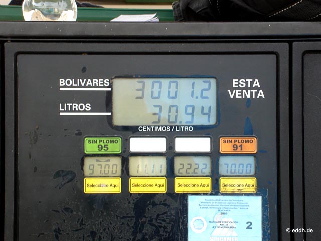 Zum Lachen ... ... (für uns allerings eher schmerzverzerrt) sind die Treibstoffpreise in Caracas, wie eddh-ler Rainer Horbert berichtet. Avgas ca. 32 Eurocents/Ltr., Rainer tankte 30 Liter Bleifrei Mogas für 0,80 Euro...!
