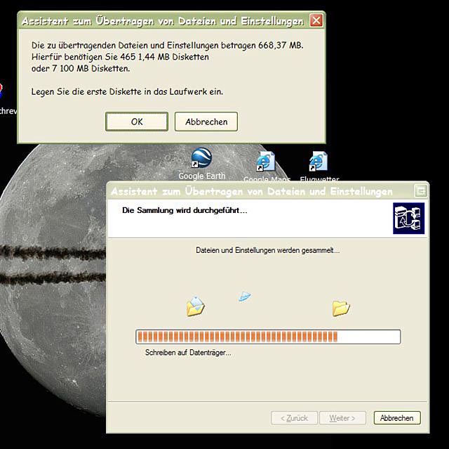 Haben Sie Geduld ... ... und viele Disketten. Als Heiko seine Computereinstellungen auf einen USB-Stick übertragen wollte, rechnete Herr Gates hartnäckig in Disketten um. Vielleicht ein neuer Geschäftszweig von ihm, bei den Mengen...
