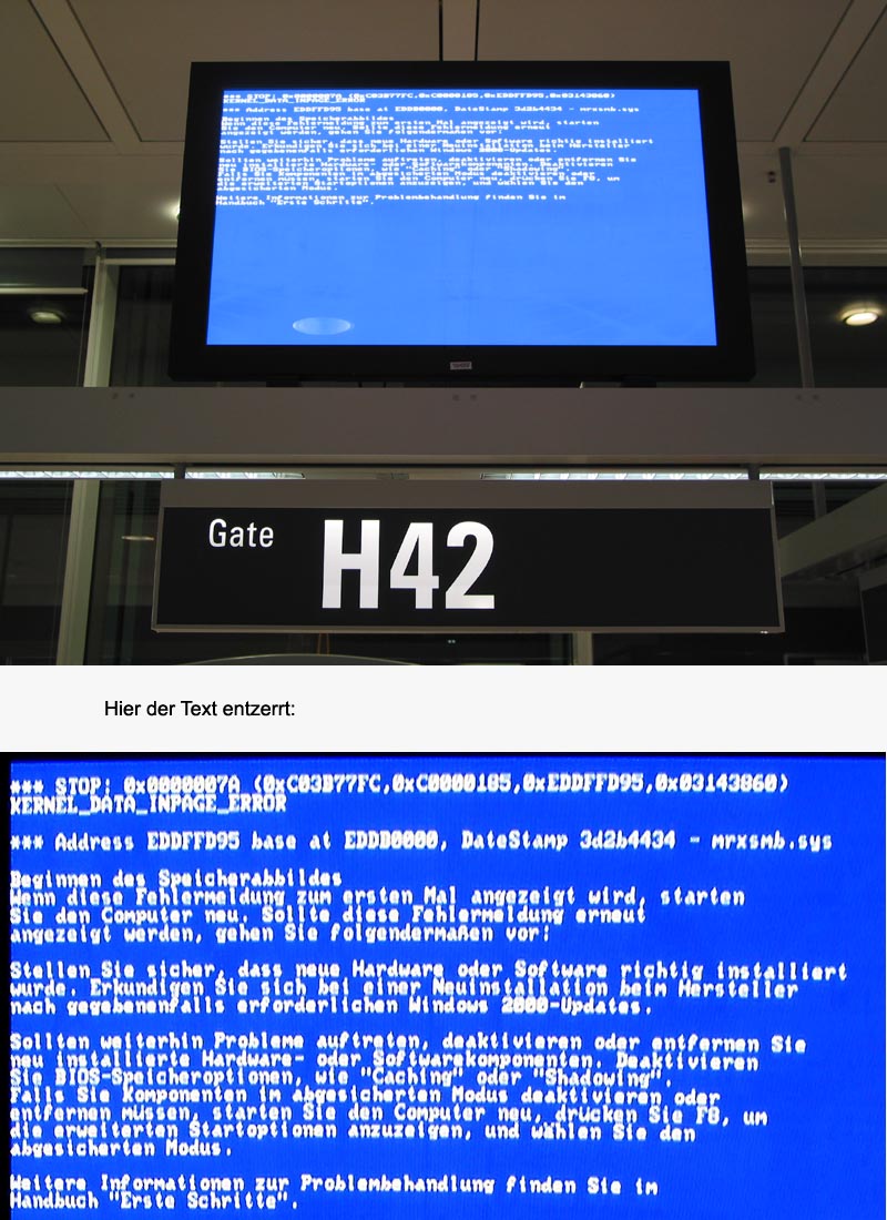 Ach so...! Wenn am Airport München statt Departures ein 'Blue-Screen' auftaucht, muss man halt im Handbuch bei 'Erste Schritte' nachsehen...